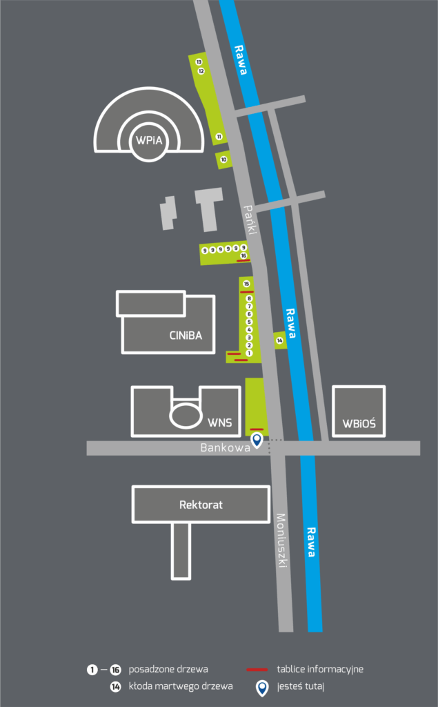 ALEJA DRZEW POLSKICH zaprasza, aby w cieniu jej gałęzi przestudiować ich pokrój, kwiaty, liście i owoce. Ścieżkę tworzy 15 gatunków drzew. Liczba gatunków nie jest przypadkowa, bo odzwierciedla ona 12 Wydziałów Uniwersytetu Śląskiego jakie znajdowały się w 2014 roku w strukturze Uniwersytetu Śląskiego, roku powstania Alei. Ponadto osobne drzewa poświecono Centrum Informacji Naukowej i Bibliotece Akademickiej, Indywidualnym Studiom Międzyobszarowym oraz niezwykłemu wydarzeniu jakim jest przyznanie tytułu Europejskiego Miasta Nauki – Katowice 2024. Każdy Wydział, zgodnie ze swoim obszarem zainteresowań naukowych, włożył cząstkę swojej wiedzy na temat drewna i drzew w ostateczny, merytoryczny kształt „Alei”. I tak dzięki tej ponadwydziałowej współpracy powstało kompendium wiedzy, z którego można się dowiedzieć o historii wykorzystania drewna w przeszłości, jego licznych, bo szacowanych dzisiaj na 30 tysięcy sposobów zastosowania. Szczególnie ciekawe są opisy drewna językiem różnych nauk – mówiące zawsze o tym samym: o drewnie. Całość zamknięta jest swoistą klamrą wiedzy ogólnej o lasach Katowic i ich dzisiejszej roli w naszym życiu. Uzupełnieniem otwartej w 2014 roku ścieżki jest jej przedłużenie w kampusie Uniwersytetu Ekonomicznego, gdzie zaprezentowane zostaną polskie drzewa iglaste.